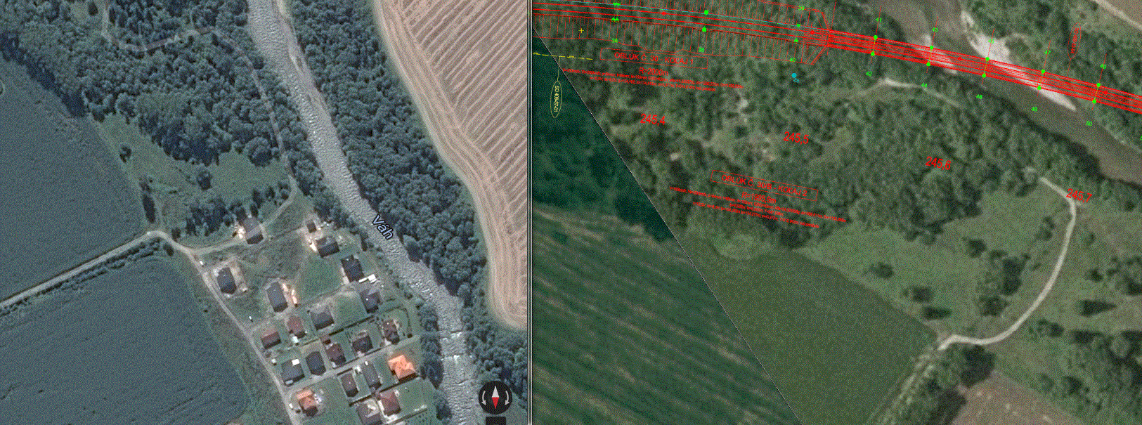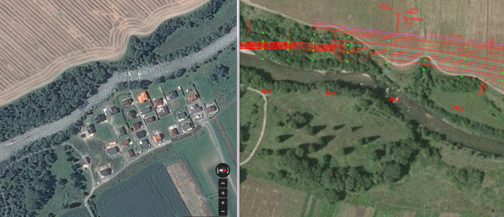 Na priložených situáciách je možné vidieť, že v uvedenom území je železničná trať vedená na násype (žkm 245,3 – 245,450), ktorý prechádza lesíkom na pravom brehu Váhu a následne od žkm 245,450 po 245,800 prekonáva koryto Váhu na moste a dostáva sa na polia na ľavom brehu rieky v katastri obce Liptovský Ján. V tomto úseku od žkm 245,800 ďalej, je trať vedená v miernom záreze. V celom popisovanom úseku žkm 245,3 – 245,800 je na železničnom telese aj na moste navrhnutá pravostranná protihluková stena (na telese násypu hnedá čiara), ktorá chráni zastavané územie pred nepriaznivým vplyvom hluku od železničnej dopravy. Trať je situovaná od obytnej zóny vo vzdialenosti minimálne 50m. Po vybudovaní modernizovanej trate s novými prvkami železničného zvršku a s protihlukovou stenou bude vplyv hluku z trate na obyvateľov zastavaného územia nižší, ako v súčasnosti, keď sa trať síce nachádza vo väčšej vzdialenosti, ale zástavba nie je chránená proti hluku žiadnymi technickými opatreniami.